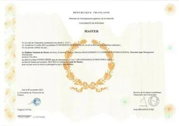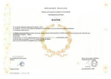 法国普瓦提埃大学国际企业管理硕士(一般方向)学位证书样本(法国国家文凭) | 法国普瓦提埃大学国际企业管理硕士(碳中和方向)学位证书样本(法国国家文凭) |